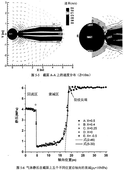 對含動態(tài)裂紋的高壓輸氣管道的流場模擬結果表明,氣體壓力模式(2-46)和(2-47)式在裂紋充分發(fā)展至不考慮回流區(qū)影響的條件下,對高壓高韌性管道仍然成立