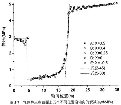 由于管道內壁處的氣體靜壓等于該處管道承受的壓力,圖5-6和圖5-7中A-E各點沿Z向的氣體靜壓變化反映了管道承受壓力的軸向衰減規(guī)律。兩圖中的初始內壓分別為10MPa和8MPa。