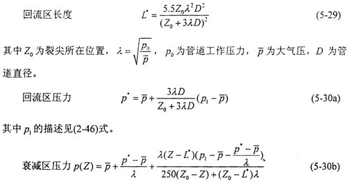 其三是衰減區(qū)的壓力變化。氣流通過裂紋尖端時,管壁上作用的氣體壓力沿軸向迅速衰減,經驗公式(2-47)中所用的衰減長度一般取為1.5倍管道直徑,最終衰減到零。計算表明衰減長度隨管道工作壓力的升高而增加,并且衰減區(qū)壓力的最低值與管道的工作壓力相關。由于對裂紋的擴展狀態(tài)影響甚微,裂尖前部的壓力不是關心的對象。