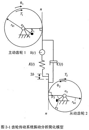圖2-1中,rb1——主動齒輪基圓半徑;rb2——從動齒輪基圓半徑;K(t)——齒輪嚙合剛度;e1——主動齒偏心距;e2——從動齒輪偏心距;β1——主動齒輪不平衡質(zhì)量的初始角度;β2——從動齒輪不平衡質(zhì)量的初始角度;δ(t)——齒輪的綜合誤差;JD1——主動齒輪轉(zhuǎn)動慣量;JD2——從動齒輪轉(zhuǎn)動慣量;C(t)——齒輪阻尼系數(shù);b——具側(cè)間隙;n-n——齒輪嚙合線方向。