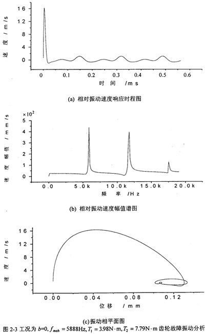 圖2-3是工況為:齒輪嚙合頻率為5888Hz、齒側(cè)間隙b=0齒輪故障振動分析,其中(a)圖為齒輪輪齒相對振動速度時程響應(yīng)圖,(b)圖為齒輪輪齒相對振動速度幅值譜圖。從圖上可看出,當(dāng)齒側(cè)間隙為0時,此時振動故障頻率為齒輪嚙合頻率fmeh。的1、2、3倍。相平面圖也穩(wěn)定于一個橢園極限環(huán)(見(c)圖)。