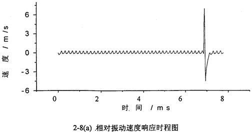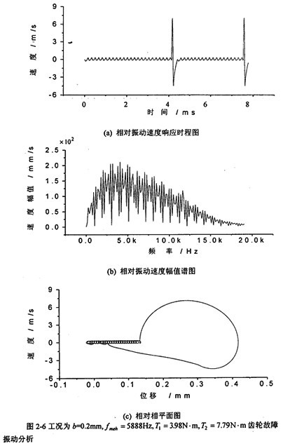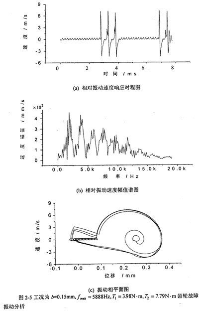 軸承對箱體動態(tài)激勵力和齒傳輸線相對振動位移X=(rb1tgθ1-rb2tgθ2)有相對振動速度 (=rb1sec2θ1 1)有關(guān),文中只列出 的計算結(jié)果,圖2-3~圖2-13為各種工況的齒輪故障振動分析,其中包括齒輪輪齒相對振動速度時程響應(yīng)圖、齒輪輪齒相對振動速度幅值譜圖和相平面圖。