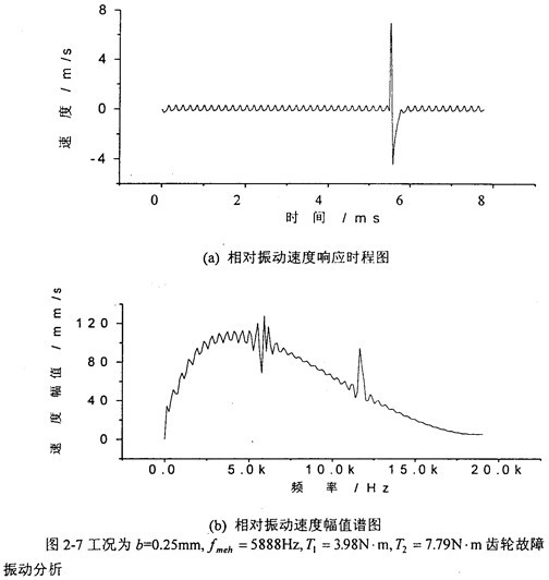 (齒厚)時,齒輪輪齒相對振動速度時程響應(yīng)圖((a)圖)和齒輪輪齒相對振動速度幅值譜圖((b)圖)。從(b)圖上可看出,當(dāng)齒側(cè)間隙增加到0.25mm時,此時振動故障頻率成份又發(fā)生了改變,振動故障頻率為齒輪嚙合頻率f