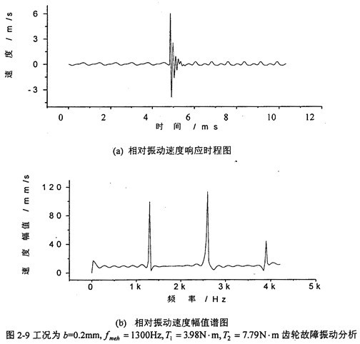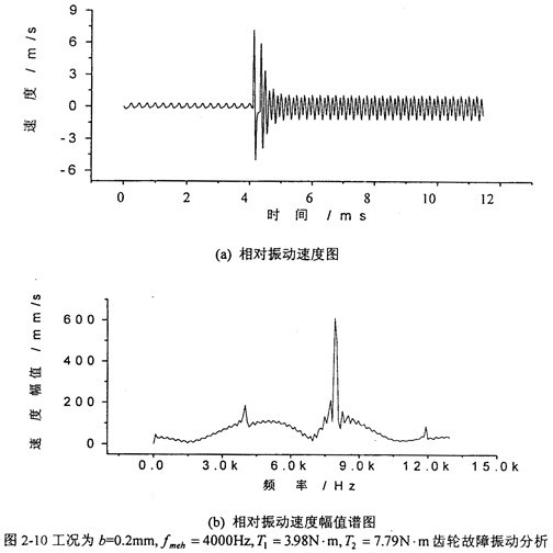 圖2-9是當(dāng)齒輪嚙合頻率為1300Hz、齒側(cè)間隙b=0.2mm時,齒輪輪齒相對振動速度時程響應(yīng)圖((a)圖)和齒輪輪齒相對振動速度幅值譜圖((b)圖)。從(b)圖上可看出,當(dāng)齒側(cè)間隙為0.2mm時,此時振動故障頻率為齒輪嚙合頻率fmeh的1、2、3倍,分數(shù)諧波不明顯。