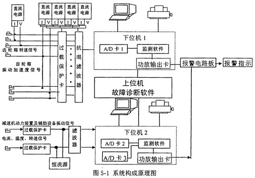 在設(shè)計(jì)以上硬件系統(tǒng)時(shí)充分考慮到工廠設(shè)備結(jié)構(gòu)復(fù)雜、現(xiàn)場干擾因素多、運(yùn)轉(zhuǎn)條件惡劣、工藝狀況頻繁變動(dòng),如軋機(jī)不斷地處于咬鋼、軋鋼、拋鋼、空轉(zhuǎn)等狀態(tài)。為了保證硬件系統(tǒng)能長期可靠地在工廠工作,傳感器、信號(hào)處理儀、數(shù)據(jù)采集卡、計(jì)算機(jī)等重要關(guān)鍵硬件產(chǎn)品應(yīng)盡量選購國際上一流水平產(chǎn)品或國內(nèi)廠家生產(chǎn)經(jīng)受使用考驗(yàn)的性能優(yōu)良的產(chǎn)品,參考國內(nèi)外在線監(jiān)測和故障診斷系統(tǒng)的硬件配置,并自行設(shè)計(jì)配制相應(yīng)附件,實(shí)施各項(xiàng)功能,并達(dá)到各項(xiàng)技術(shù)指標(biāo)。根據(jù)現(xiàn)場調(diào)查和專家論證,齒輪減速機(jī)的監(jiān)測和故障診斷為某整個(gè)區(qū)域的核心和重點(diǎn)。圖5-1是硬件系統(tǒng)構(gòu)成原理圖。