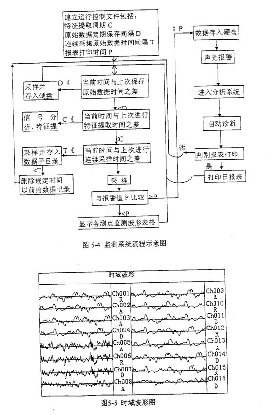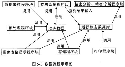 軟件的各個(gè)模塊通過動(dòng)態(tài)數(shù)據(jù)和運(yùn)行狀態(tài)數(shù)據(jù)庫聯(lián)系在一起,在下位機(jī)中,監(jiān)測系統(tǒng)控制著動(dòng)態(tài)數(shù)據(jù)的采集、存儲(chǔ)、顯示和預(yù)處理,同時(shí)把監(jiān)測結(jié)果存入各機(jī)組運(yùn)行狀態(tài)特征數(shù)據(jù)庫。在上位機(jī)中,詳細(xì)分析診斷程序塊調(diào)用運(yùn)行狀態(tài)數(shù)據(jù)庫,得出診斷結(jié)果并調(diào)用打印程序塊輸出。圖5-3為數(shù)據(jù)流程示意圖,圖5-4為監(jiān)測系統(tǒng)流程示意圖。