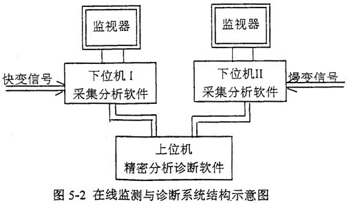 為了適應(yīng)日益更新的生產(chǎn)實(shí)際多種類型參數(shù)監(jiān)測和故障診斷的要求,建立由多臺(tái)微機(jī)并行運(yùn)行構(gòu)成的在線連續(xù)實(shí)時(shí)監(jiān)測與快速診斷系統(tǒng)。圖5-2為多微機(jī)在線監(jiān)測與診斷系統(tǒng)結(jié)構(gòu)示意圖。這樣做的優(yōu)點(diǎn)是: