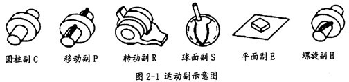 在等角速萬(wàn)向聯(lián)軸器中,大部分都屬于連桿機(jī)構(gòu).最古老的雙聯(lián)十字軸萬(wàn)向聯(lián)軸器機(jī)構(gòu)就是球面四連桿機(jī)構(gòu)。從大量的不同的機(jī)構(gòu)綜合中,有可能得出多種實(shí)用的等角速連桿機(jī)構(gòu),所以研究等角速理論,以連桿機(jī)構(gòu)的型式和尺度關(guān)系為對(duì)象,進(jìn)行新的等角速理論的探索,在一定的意義上是可行的。在機(jī)構(gòu)學(xué)上,構(gòu)件同構(gòu)件間的連接稱(chēng)為副,其不同的形式和代號(hào)如圖2-1所示: