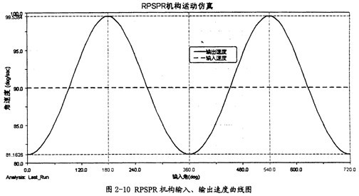 在此仿真中共輸出了此模型運(yùn)動(dòng)兩周的曲線(xiàn),這證明此模型中雙曲柄肯定存在,按前面的理論,如果機(jī)構(gòu)是鏡面機(jī)構(gòu),在輸入轉(zhuǎn)速恒定的情況下,則輸出轉(zhuǎn)速就是恒定的,在圖2-10中,在輸入轉(zhuǎn)速恒定為90°/s時(shí),其輸出轉(zhuǎn)速是周期變化的。后來(lái)經(jīng)模型修改,將原模型改為完全對(duì)稱(chēng)結(jié)構(gòu),滿(mǎn)足鏡面機(jī)構(gòu)的條件,重新進(jìn)行仿真,得出的結(jié)果是輸入轉(zhuǎn)速同輸出轉(zhuǎn)速完全相等。這從正反兩面說(shuō)明了前面理論的正確性,同時(shí)也說(shuō)明要想得到等角速傳動(dòng)并不是一件簡(jiǎn)單的事。不過(guò)本次證明只是對(duì)一種形式機(jī)構(gòu)而言,有關(guān)其它的機(jī)構(gòu)形式,還需要進(jìn)一步的探索。