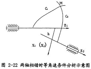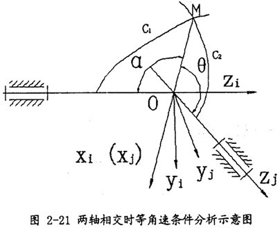 a.兩軸相交時(shí),兩軸交點(diǎn)與嚙合點(diǎn)恒位于兩軸線(xiàn)所成夾角的平分面上,可實(shí)現(xiàn)萬(wàn)向聯(lián)軸器等角速轉(zhuǎn)動(dòng)(又稱(chēng)同步);