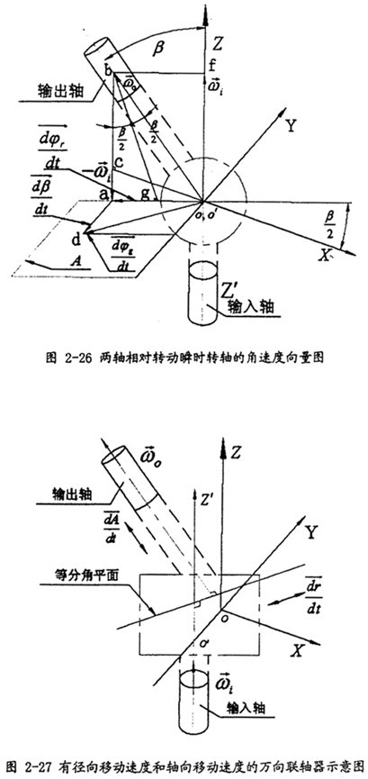 如圖2-28所示,輸入軸與輸出軸通過(guò)一個(gè)萬(wàn)向聯(lián)軸器J聯(lián)接,兩軸夾角β為變量,輸出軸相對(duì)于輸入軸存在瞬時(shí)轉(zhuǎn)動(dòng)——滑動(dòng)軸,用矢量