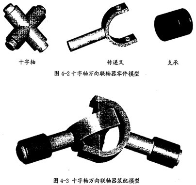 當(dāng)前,在工程領(lǐng)域,應(yīng)用美國(guó)PTC公司的CAD軟件Pro/E和美國(guó)MDI公司的動(dòng)力學(xué)仿真軟件ADAMS聯(lián)合進(jìn)行復(fù)雜機(jī)械系統(tǒng)的動(dòng)力學(xué)仿真研究是一種較實(shí)用、較流行的仿真方案。本文的仿真分析中所有模型均是采用這種方案。考慮到建模的注意因素,在用Pro/E建模的過(guò)程中,省去了十字軸萬(wàn)向聯(lián)軸器的許多細(xì)小結(jié)構(gòu),如潤(rùn)滑部分、滾針軸承、彈簧卡圈等,只是保留了十字軸萬(wàn)向聯(lián)軸器在原理上進(jìn)行傳動(dòng)的必需構(gòu)件和運(yùn)動(dòng)副。在此原則下建立的十字軸萬(wàn)向聯(lián)軸器的各構(gòu)件模型如圖4-2所示,實(shí)際上只包含十字軸和傳遞叉兩個(gè)活動(dòng)構(gòu)件。建立的十字軸萬(wàn)向聯(lián)軸器的裝配模型如圖4-3所示。