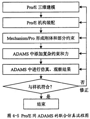 在仿真中如果發(fā)現(xiàn)結(jié)果不對(duì),則我們需要對(duì)前面的模型進(jìn)行修正,然后再做仿真分析,直到結(jié)果正確。決而言之利用Pro/E和ADAMS進(jìn)行聯(lián)合仿真,其基本的步驟如圖4-5所示。