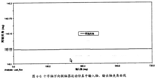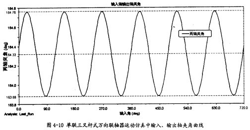 由圖4-10可以知道,輸入軸同輸出軸的夾角在三叉桿式萬(wàn)向聯(lián)軸器運(yùn)轉(zhuǎn)時(shí)是不斷變化的,在每一個(gè)回轉(zhuǎn)周期中,它的變化頻率為3次,這證明了這種聯(lián)軸器是一種非定心式萬(wàn)向聯(lián)軸器,同時(shí)在一定的程度上驗(yàn)證了三叉桿式三軸頸的交點(diǎn)以三倍于萬(wàn)向聯(lián)軸器的轉(zhuǎn)速作圓周運(yùn)動(dòng)的理論的正確性。另外還可看出盡管夾角在不斷變化,但變化非常小,對(duì)兩軸的夾角大小影響很小,本次仿真中夾角大小平均是164.32°(其補(bǔ)角為15.7°,即是第三章中理論計(jì)算中的角度之一)。