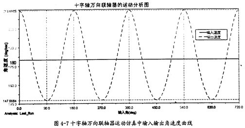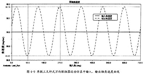 由圖4-9可以知道,當(dāng)輸入軸轉(zhuǎn)速恒定為90o/s時(shí),輸出軸并不作恒速轉(zhuǎn)動(dòng),而是以90o/s為中心,作非常有規(guī)律的周期性運(yùn)動(dòng),在每一個(gè)回轉(zhuǎn)周期中,它的變化頻率為3次。這里的結(jié)果同第三章中的曲線(xiàn)圖3-8也是完全吻合的,因此在一定的程度上也證明了三叉桿萬(wàn)向聯(lián)軸器轉(zhuǎn)速分析理論的正確性。