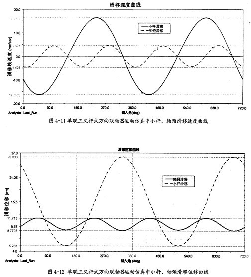 由圖4-11可以知道,在一定的夾角下,小桿在滑道中的滑移速度同小桿球面中心相對(duì)軸頸的滑移速度是不同的,前者要遠(yuǎn)大于后者,且它們變動(dòng)的頻率也不一樣,在一個(gè)回轉(zhuǎn)周期中,前者頻率是1次,而后者是2次。此圖中的兩曲線(xiàn)同第三章中的理論分析曲線(xiàn)圖3-11、圖3-12是吻合的,只是小桿滑移的速度曲線(xiàn)在外形上有一點(diǎn)差異,仿真的曲線(xiàn)相當(dāng)?shù)钠交⒁?guī)則,但理論分析曲線(xiàn)卻不規(guī)則,這可能是在計(jì)算中簡(jiǎn)化和省略的原因。盡管如此,這也證明了三叉桿式萬(wàn)向聯(lián)軸器理論分析中對(duì)小桿滑移速度和軸頸滑移速度這兩項(xiàng)計(jì)算的正確性。