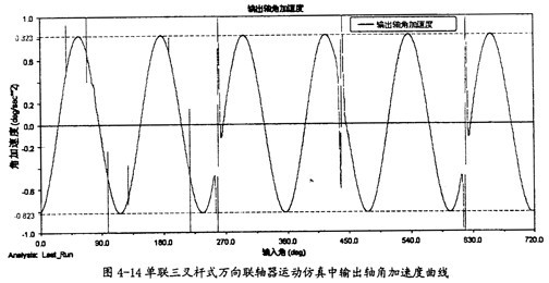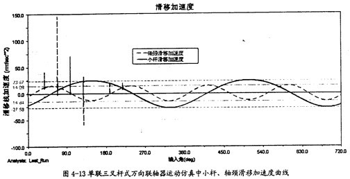 由圖4-13可以知道,在一定的夾角下,小桿在滑道中有滑移加速度同小桿球面中心相對(duì)軸頸的滑移加速度是不同的,前者要大于后者,且它們變動(dòng)的頻率也不一樣,在一個(gè)回轉(zhuǎn)周期中前頻率是1次,而后者2次。此圖中的兩曲線(xiàn)同第三章中的理論分析曲線(xiàn)圖3-13、圖3-14是吻合的,只是小桿滑移的加速度曲線(xiàn)在外形上有差異,仿真的曲線(xiàn)相當(dāng)?shù)钠交、?guī)則,但理論分析曲線(xiàn)卻不規(guī)則,這可能是在計(jì)算中簡(jiǎn)化和省略的原因。盡管如下,這在一定的程度上也證明了三叉桿式萬(wàn)向聯(lián)軸器理論分析中對(duì)小桿滑移加速度和軸頸滑移加速度這兩項(xiàng)計(jì)算的正確性。(值得說(shuō)明的是此圖中曲線(xiàn)有時(shí)有突變的現(xiàn)象,主要是考慮到計(jì)算機(jī)的性能,計(jì)算中步長(zhǎng)稍大的原故。在后面的分析曲線(xiàn)中也出現(xiàn)了這樣的情況,將不再作說(shuō)明。)