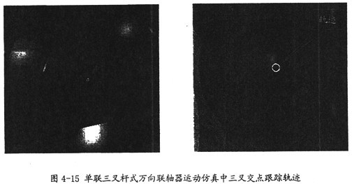 由圖4-15可以看出,在單聯(lián)三叉桿式萬(wàn)向聯(lián)軸器的運(yùn)動(dòng)仿真中,三叉交點(diǎn)運(yùn)動(dòng)軌跡是一個(gè)圓,相對(duì)于半徑值R(此值的意義見(jiàn)第三章)它的半徑是相當(dāng)小的,這也解釋了為何運(yùn)動(dòng)中兩軸夾角在不斷作微小的變化,同時(shí)也證明了軸頭中心軌跡理論的正確性。