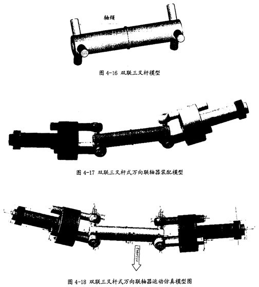 本章中引入計(jì)算機(jī)仿真技術(shù),利用目前世界上最具權(quán)威的機(jī)械系統(tǒng)虛擬樣機(jī)仿真軟件ADAMS對(duì)十字軸式萬(wàn)向聯(lián)軸器、單聯(lián)三叉桿式萬(wàn)向聯(lián)軸器和雙聯(lián)三叉桿式萬(wàn)向聯(lián)軸器進(jìn)行了運(yùn)動(dòng)學(xué)仿真,得到了許多可視化的數(shù)據(jù)結(jié)果。驗(yàn)證了利用AOAMS進(jìn)行機(jī)械多體系統(tǒng)仿真的有效性和正確性,同時(shí)得到了三叉桿式萬(wàn)向聯(lián)軸器以前未被發(fā)現(xiàn)的運(yùn)動(dòng)規(guī)律,為這種聯(lián)軸器的進(jìn)一步開(kāi)發(fā)利用提供了基礎(chǔ)。