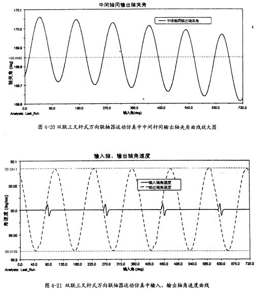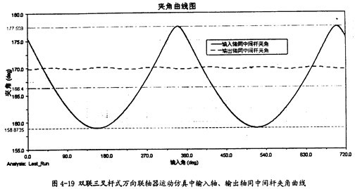 由圖4-20可以看出,中間桿同輸出軸間的夾角變化也呈現(xiàn)一定的規(guī)律,在每-個(gè)回轉(zhuǎn)周期中,它的變化頻率為3次。結(jié)合圖4-19、圖4-20可知中間桿同輸入軸及輸出軸夾角的變化頻率是不-樣的,這是雙聯(lián)三叉桿式萬(wàn)向聯(lián)軸器有別于單聯(lián)三叉桿式萬(wàn)向聯(lián)軸器的一種特性。