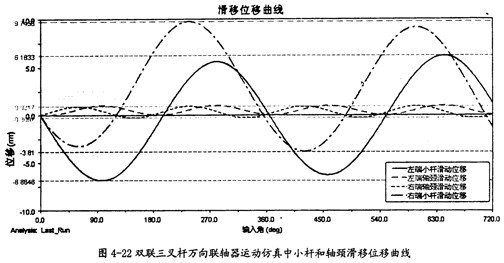 由圖4-22可以看出,雙聯(lián)三叉桿式萬(wàn)向聯(lián)軸器在運(yùn)轉(zhuǎn)的過(guò)程中,左右兩端的小桿滑移位移量幾乎相等,左右兩端軸頸的滑移位移量也接近等值,且軸頸的滑移位移量比小桿沿滑道滑動(dòng)的位移量要小得多,這同單聯(lián)三叉桿式萬(wàn)向聯(lián)軸器的特性是相同的。