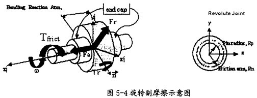 旋轉(zhuǎn)副產(chǎn)生摩擦的示意圖如圖5-4所示。在這種運動副中只會產(chǎn)生逆向于旋轉(zhuǎn)方向。(如圖5-4中藍色箭頭所示)的摩擦扭矩Tfrict(如圖5-4中紅色箭頭所示),它的產(chǎn)生主要由三種因素,即構(gòu)件間相互作用的徑向力Fr、構(gòu)件間相互作用的軸向力Fa、構(gòu)件間相互作用的彎矩Tr(這三種力如圖5-4中綠色箭頭所示)。在施加由這些作用力產(chǎn)生的摩擦力時,要考慮徑向力Fr的大小、圓柱半徑RP(如圖5-4右圖所示)、軸向力Fa的大小、摩擦半徑Rn的大。ㄈ鐖D5-4右圖所示)、彎矩Tm的大小和彎矩的反作用臂長(即旋轉(zhuǎn)副的長度,如圖5-4中左圖所示),另外還得考慮靜摩擦系、動摩擦系數(shù)及預(yù)載荷的作用。