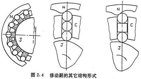 圖2.4所示是推桿與導(dǎo)槽所構(gòu)成的移動副的另外幾種形式,它們也未能很好地解決移動副所帶來的滑動摩擦問題。