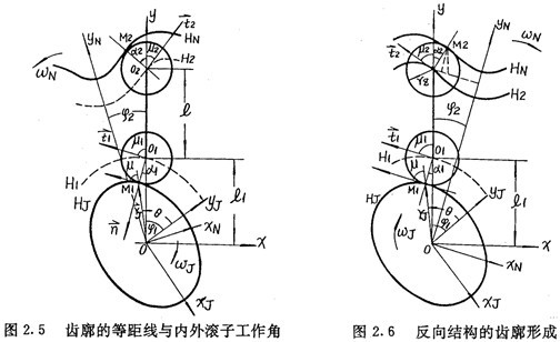 本章根據(jù)推桿減速器的結(jié)構(gòu)特征,找出了推桿內(nèi)外滾子工作角之間的關(guān)系。這種關(guān)系不僅適用于激波器廓形為偏心圓的單激波推桿減速器結(jié)構(gòu),而且也適用于激波器廓形為非圓弧曲線的多激波推桿減速器。利用內(nèi)外滾子工作角之間的關(guān)粵和法向等距線的幾何性質(zhì),首次分析研究了激波器廓形為任意形狀非圓弧曲線的多激波推桿減速器的齒廓形成理論,與傳統(tǒng)的包絡(luò)法相比,具有概念清晰,所得公式形式簡單的特點(diǎn),通過實(shí)例計(jì)算,證明了激波器為偏心圓的推桿減速器,其內(nèi)齒圈齒廓曲線不是擺線這一重要結(jié)論。