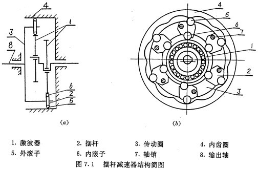 圖7.1所示為擺桿減速器的結(jié)構(gòu)簡(jiǎn)圖。擺桿減速器也由四大部分組成:激波器1;擺動(dòng)機(jī)構(gòu)(包括擺桿2,內(nèi)滾子6, 外滾子5和軸銷(xiāo)7);傳動(dòng)圈3 以及與其固聯(lián)的輸出軸8;內(nèi)齒圈4?梢钥闯觯藬[動(dòng)機(jī)構(gòu)外,其它構(gòu)成與推桿減速器類(lèi)似。也采用了兩套完全相同且互成180°的激波器及內(nèi)齒圈以實(shí)現(xiàn)輸出的靜平衡和提高嚙合效率。