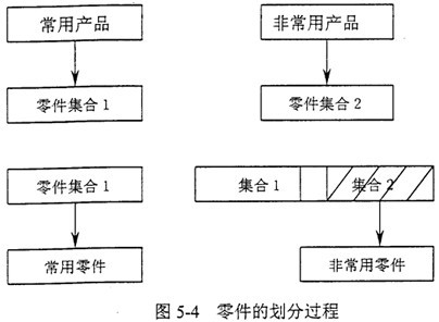 劃分常用零件與非常用零件的依據(jù)是:詳細劃分各種系列產(chǎn)品中對應的零件,分為常用要求和非常用要求二種狀態(tài),常用要求下對應下的零件集合為常用零件:非常用要求下對應下的零件集合,減去常用零件集合為非常用零件,即扣除常用零件便得非常用零件。具體過程見圖5-4。