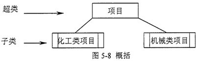 3、概括(Generalization):定義類型之間的一種子集聯(lián)系。它抽象了類型之間的“is ubset of”的語義。例如項目是個實體型,機械類項目也是實體型,化工類項目也是實體型。機械類項目、化工類項目均是項目的子集。我們把項目稱為超類(Superclass),將機械類項目、化工類項目成為項目的子類(Subclass),見圖5-8。