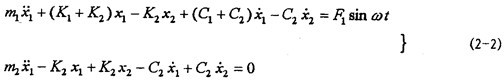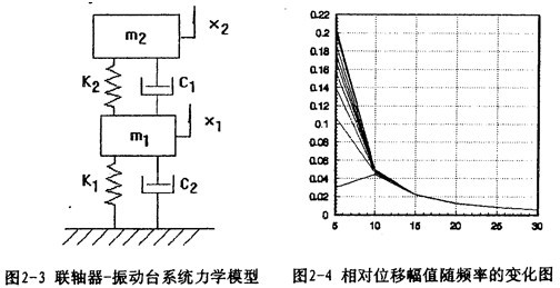 對應(yīng)的力學(xué)模型如圖2-3(見22頁)所示,式中m1為振動臺動圈、聯(lián)軸器外套及固定在振動臺上夾具的質(zhì)量;m2為聯(lián)軸器內(nèi)套、芯軸及配重的質(zhì)量;K1為振動臺支撐動圈部分的剛度系數(shù),K2為聯(lián)軸器彈性元件的剛度系數(shù);C1為振動臺動圈阻尼系數(shù);C2為聯(lián)軸器