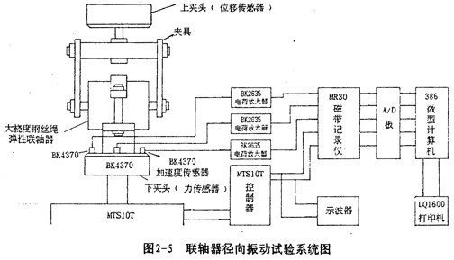 我們選用正弦激勵信號,頻率變化范圍選為l-30Hz,振幅變化范圍為±(l-8)毫米。試驗時,測量每一特定頻率、振幅下的加速度、速度、位移和力的振動信號,為了保證有足夠大的激勵力在不同頻率下使聯(lián)軸器達到穩(wěn)態(tài)周期大位移振動,選擇適當?shù)募钤O(shè)備至關(guān)重要。
