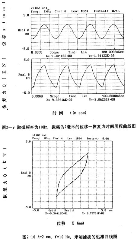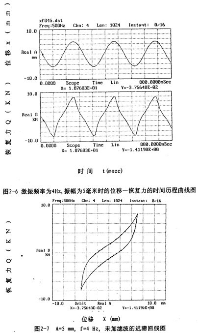 信號處理時,將磁帶記錄儀記錄的五路振動信號經(jīng)磁帶記錄儀回放,愉出到數(shù)據(jù)采集板(A/D板)進行五路振動信號(恢復(fù)力、位移、速度、加速度信號)同步采樣和A/D轉(zhuǎn)換,然后輸出到PC386微機存人磁盤,該數(shù)據(jù)采集系統(tǒng)采集的數(shù)據(jù)都是以二進制形式存儲的文件。為了計算和閱讀方便,需將二進制數(shù)據(jù)文件轉(zhuǎn)換成ASC碼文件,然后再編程進行數(shù)據(jù)處理.對處理后形成的數(shù)據(jù)文件進行作圖可以形成許多相應(yīng)的曲線圖,圖2-6至圖2-13是眾多曲線中的一部分。