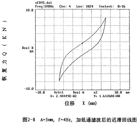 圖2-6表示激振頻率為4Hz,振動位移幅值為±5毫米的位移和恢復(fù)力的時間歷程曲線圖,由圖可知,位移時間歷程為正弦波形,對應(yīng)的恢復(fù)力時間歷程為近似的鋸齒波形。以位移為橫坐標,恢復(fù)力為縱坐標,圖2-6對應(yīng)的位移恢復(fù)力圖為圖2-7,由此圖可知彈性聯(lián)軸器具有非線性遲滯特性。在動態(tài)情況下,由于機座的高頻振動和環(huán)境干擾等因素,試驗記錄的信號中有高頻成分存在,這使得遲滯回線不光滑,加低通數(shù)字濾波后可得光滑的遲滯回線,如圖2-8所示。