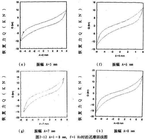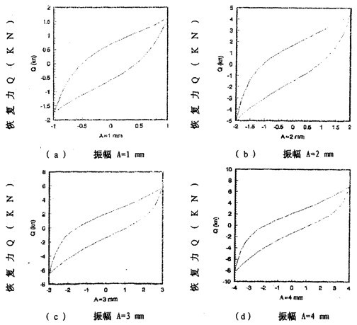 圖2-9(見26頁)表示激振頻率為1OHz,振動位移幅值為±2毫米的位移和恢復(fù)力時間歷程圖,圖2-10(見26頁)、圖2-11(見27頁)為對應(yīng)的遲滯回線圖。圖2-l2(見27、28頁)表示激振頻率為IHz,振動位移幅值分別為±(1-8)毫米的位移一恢復(fù)力圖,圖2-14(見29頁)則為圖2-12的合圖,由圖2-14同頻率不同振幅的八條遲滯回線分析可知,大撓度剛絲繩彈性聯(lián)軸器的動剛度與振動幅值有關(guān),同時,從遲滯回線面積(表示聯(lián)軸器阻尼所耗散的能量)可知聯(lián)軸器的阻尼與振動幅值也有關(guān),即聯(lián)軸器的動剛度和阻尼均是振幅的非線性函數(shù)。