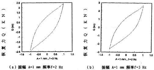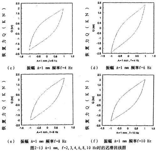 圖2-13(見28、29頁)表示振幅為l毫米,激振頻率分別為2,3,4,6,8,10Hz的遲滯回線圖,圖2-15(見29頁)表示振幅為1毫米,激振頻率為1,2,3,4,6,8,10,20,30Hz的遲滯回線合圖。由圖2-15可知,彈性聯(lián)軸器的動剛度與振動頻率有關(guān),即隨著頻率增大,對應(yīng)的遲滯回線的恢復(fù)力與位移的比值變小,當頻率在8Hz至30Hz范圍內(nèi)時,遲滯回線基本重合,由此可知鋼絲繩聯(lián)軸器動剛度在一定頻率范圍內(nèi)與頻率有關(guān)、當頻率增大到8Hz以后,聯(lián)軸器的動剛度不再隨頻率變化而變化,因而聯(lián)軸器的動剛度在一定頻率范圍內(nèi)是頻率的非線性函數(shù),當頻率增大到一定值后,動剛度與頻率無關(guān)。同樣,聯(lián)軸器的阻尼在一定頻率范圍內(nèi)是頻率的非線性函數(shù),當頻率增大到一定值后(這里是8Hz),阻尼與頻率無關(guān)。