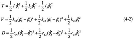 對(duì)轉(zhuǎn)換成鏈狀結(jié)構(gòu)的系統(tǒng),應(yīng)用拉格朗日法建立系統(tǒng)的扭振動(dòng)力學(xué)方程,系統(tǒng)中帶有粘性阻尼,因此列出含有耗散函數(shù)的拉格朗日方程