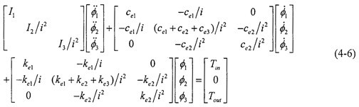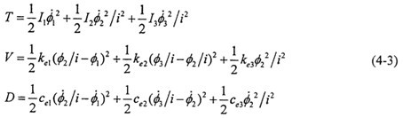 分別為轉(zhuǎn)換前后各慣性元件的扭轉(zhuǎn)角,按傳動(dòng)比關(guān)系有: