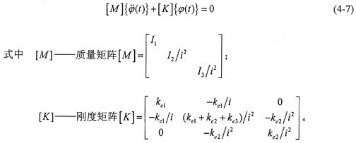 在分析和評(píng)價(jià)減速器系統(tǒng)扭振特性時(shí),需要計(jì)算系統(tǒng)的各階固有頻率以及相應(yīng)的主振型,這就要求解系統(tǒng)的無(wú)阻尼自由振動(dòng)方程。當(dāng)系統(tǒng)自由振動(dòng)時(shí),激振力矩和阻尼均為零,此時(shí)系統(tǒng)的動(dòng)力學(xué)方程可表示為
