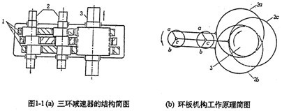 由于雙曲柄機(jī)構(gòu)在曲柄旋轉(zhuǎn)一周要經(jīng)過對(duì)稱的兩個(gè)“死點(diǎn)”位置,可以采用兩相(套)以上的并列雙曲柄機(jī)構(gòu)以克服“死點(diǎn)”的不確定性。如三環(huán)減速器(見圖1-1),它是由相位差互為120°的三套平行雙曲柄機(jī)構(gòu)組成的三相并列雙曲柄機(jī)構(gòu)。當(dāng)某一套雙曲柄機(jī)構(gòu)位于“死點(diǎn)”位置時(shí),另兩套雙曲柄機(jī)構(gòu)通過支承高速軸傳遞扭矩推動(dòng)其越過“死點(diǎn)”位置。這種結(jié)構(gòu)的缺點(diǎn)是軸向尺寸大,中間齒板安裝比較困難,必須采用偏心套形式。高速軸上的鍵槽分度精度要求高。另外,三片行星齒輪,運(yùn)轉(zhuǎn)過程中容易出現(xiàn)載荷分配不均的現(xiàn)象。采用這種原理克服“死點(diǎn)”的連桿行星齒輪傳動(dòng)還有單齒環(huán)(見圖1-3)等減速器。