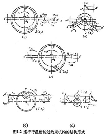 連桿行星齒輪傳動(dòng)機(jī)構(gòu)還有如圖1-2所示的各種形式。圖1-1和圖1-2(a)、(b)、(d)、(e)均為平行四邊形機(jī)構(gòu),圖1-2(e)為反平行四邊形機(jī)構(gòu)。其中圖1-2(d)、(e)的連桿行星齒輪為外齒輪,其余均為內(nèi)齒輪。