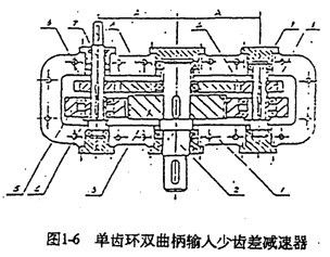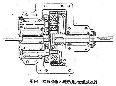 雙曲柄機(jī)構(gòu)中,如果在兩根曲軸上都有動(dòng)力輸入,則“死點(diǎn)”位置也就自然不存在了。因此,可以通過一套定軸傳動(dòng)機(jī)構(gòu)把動(dòng)力從一輸入高速軸傳遞到另一高速軸,從而克服機(jī)構(gòu)“死點(diǎn)”。根據(jù)這種原理制成的雙曲柄輸入少齒差行星齒輪裝置之不理的類型很多,如太原工學(xué)院五十年代研制的雙曲柄輸入漸開線少齒差減速器(見圖1-4)、英國專利(見圖1-5)、、重慶鋼鐵公司研制的單齒環(huán)雙曲柄輸入少齒差減速器(見圖1-6)、日本松本和幸等人研制的RV減速器(見圖1-7)。其特點(diǎn)都是通過外嚙合齒輪副將輸入動(dòng)力分流、傳遞到多個(gè)曲柄軸上,形式多軸輸入,從而克服“死點(diǎn)”。這種結(jié)構(gòu)的特點(diǎn)是其傳動(dòng)比為定軸傳動(dòng)的傳動(dòng)比與少齒差行星齒輪傳動(dòng)的傳動(dòng)比之乘積,因而可以通過改變外嚙合齒輪的齒數(shù)方便函地滿足不同傳動(dòng)比的要求,適應(yīng)性強(qiáng)。其不足之處是結(jié)構(gòu)復(fù)雜,而且在高速軸之間存在兩平行傳動(dòng)的剛性傳動(dòng)鏈(外齒輪嚙合副和雙曲柄機(jī)構(gòu))對(duì)誤差比較敏感,加工精度要求很高。