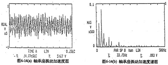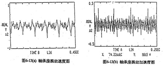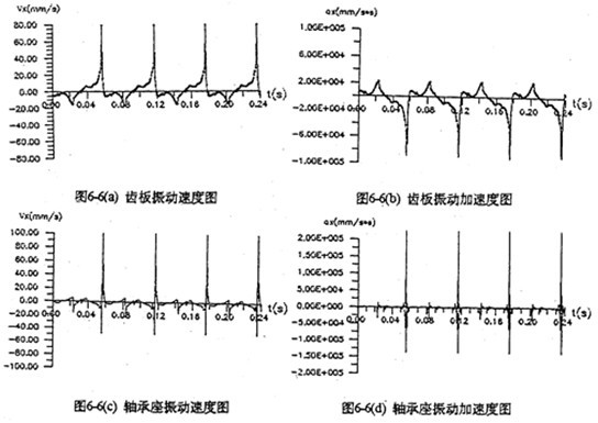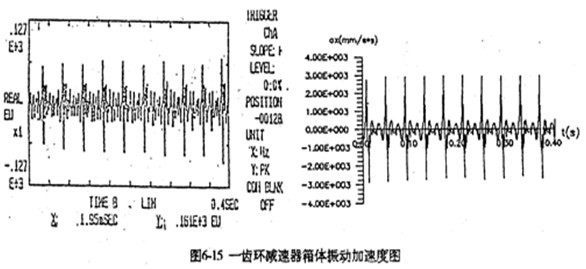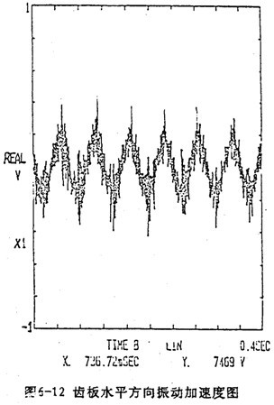 由于每片齒板都存在同樣的周期性激勵沖擊函數,相位差120°,迭加后的總效果仍然是轉頻周期函數。因此對箱體軸承座的沖擊也呈周期性。圖6-13是支承軸箱體軸承座的振動速度及加速度的實測時域曲線圖。其曲線圖的變化規(guī)律及幅值與圖6-4完全接近。速度及速度沖擊值為