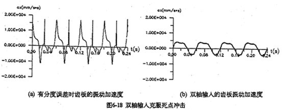 采用雙軸輸人的齒板及箱體軸承座振動速度、加速度如圖6-17所示。從圖看出齒板速度及加速度值明顯變。閱屋S輸人時的0.3倍),而且無沖擊,完全屬于穩(wěn)太振動。箱體的振動速度及加速度幅值只是單軸輸人時的0.2倍。圖6-18a是一軸的偏心套存在0.05度的分度誤差時齒板的加速度曲線圖,圖中明顯出現加速度沖擊棒線。采用雙軸輸入后,死點沖擊被徹底(見圖6-18b) , 變成穩(wěn)態(tài)振動曲線了。因此,為了減小三環(huán)減速器的振動,有必要加大三環(huán)減速器的橫向尺寸,在箱體內增加一套雙軸輸入的齒輪功率分流機構,或者在箱體外另設計一套功率分流機構,以解決機構過死點的振動問題。