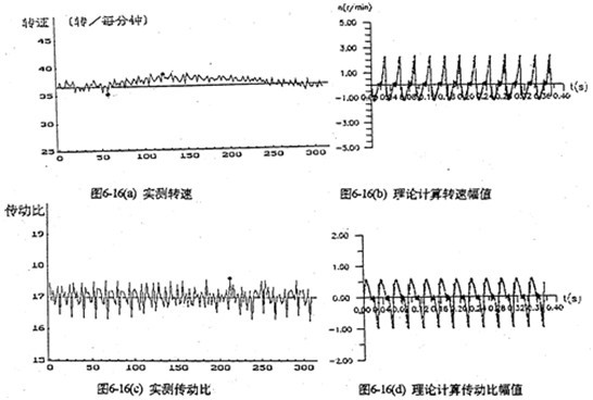 由于機構的變形及誤差等原因,將使輸出轉速及傳動比動變化,沖擊箱體、產生振動。圖6-16是對SHLEO15 型三環(huán)減速器實測及理論計算的轉速和傳動比隨時間變化的波動曲線。輸出轉速對比為