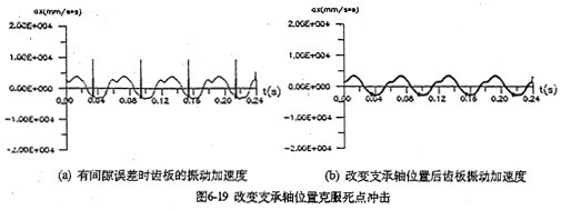 在上一章已經分析過,當三軸水平布置而且高速軸在輸出軸的同側時,載荷幅值最大,各相嚙合力等都很不均衡(見圖5-24)。圖6-19是將支承軸布置在輸入軸與輸出軸間的150°位置時齒板的振動加速度。由圖可知,因誤差引起的沖擊已被完全克服,而且原有的穩(wěn)態(tài)幅值也降低了很多。