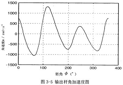 首先由圖3-2可以看到,若機(jī)構(gòu)結(jié)構(gòu)參數(shù)設(shè)計(jì)恰當(dāng),并且調(diào)整中間滑塊3偏移到合適的位置時(shí),可在一定范圍內(nèi),產(chǎn)生一個(gè)反向的速度波適度抵消原速度波動(dòng)。再由圖3-3可知,在未加入第二自由度時(shí),加速度變化值不大,說(shuō)明阻力矩和電機(jī)主動(dòng)力矩不會(huì)受到大的影響,不致導(dǎo)致原機(jī)械系統(tǒng)的各項(xiàng)參數(shù)發(fā)生大的變化。