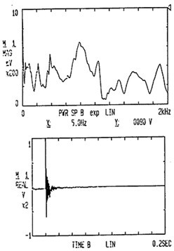 試件7上的振動信號與脈沖激勵的響應信號通過傳感器20取出信號,然后經(jīng)過放大器21放大后,用磁帶記錄儀22記錄并可采用頻譜分析儀23監(jiān)控并分析,而其上的噪聲信號可以通過聲強儀25的測頭26取出信號后送入22和23中用于分析研究。
