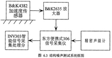 在測(cè)試產(chǎn)對(duì)所有的加速度傳感器,放大器及數(shù)據(jù)自動(dòng)采集處理系統(tǒng)進(jìn)行校準(zhǔn),對(duì)規(guī)定的所有測(cè)點(diǎn)進(jìn)行打磨,平磨并做好標(biāo)記,測(cè)試時(shí)在規(guī)定工況下依次將傳感器磁性底座放在各測(cè)點(diǎn)上。傳感器測(cè)得的振動(dòng)信號(hào)(包括速度級(jí)和加速度級(jí)振動(dòng)信號(hào))經(jīng)電荷放大器放大后進(jìn)入16通道卡式采集儀進(jìn)行采集記錄,用智能動(dòng)態(tài)信號(hào)分析儀分析各測(cè)點(diǎn)的1/3倍頻程度級(jí)結(jié)構(gòu)噪聲,再對(duì)所有的測(cè)點(diǎn)的結(jié)構(gòu)噪聲值做對(duì)數(shù)平均,得到總的結(jié)構(gòu)噪聲頻譜圖?諝庠肼曈寐暭(jí)計(jì)測(cè)量減速裝置各個(gè)測(cè)點(diǎn)的A計(jì)權(quán)聲壓級(jí)和1/1倍頻程聲壓級(jí)。各測(cè)點(diǎn)距齒輪箱測(cè)量表面的距離為1米。測(cè)試前已用標(biāo)準(zhǔn)噪聲源HY203-93260對(duì)聲級(jí)計(jì)進(jìn)行校準(zhǔn)。測(cè)試系統(tǒng)框圖如圖6.3所示。測(cè)試設(shè)備如下: